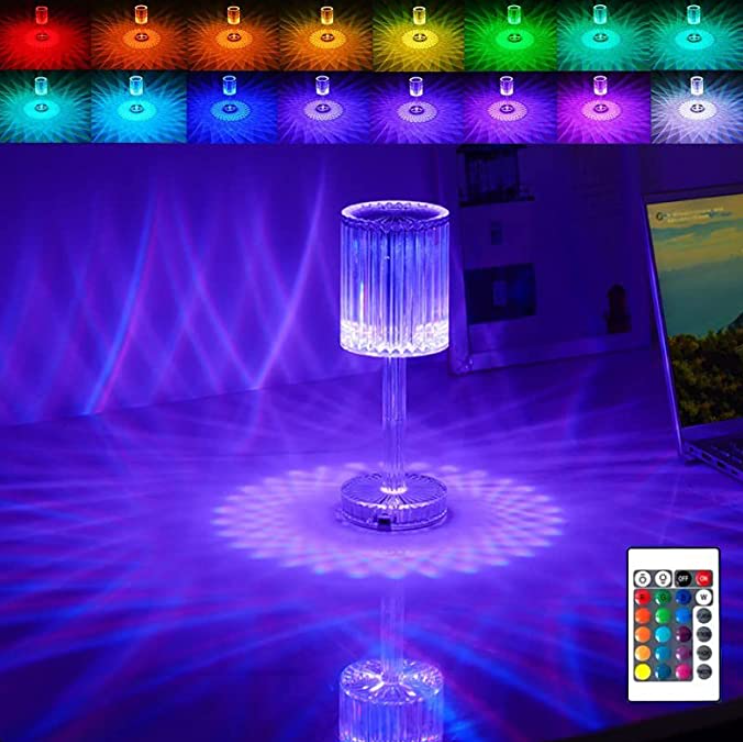 Lámpara de cristal de diseño moderno: la lámpara de cristal está hecha de material acrílico transparente PC+, que es duradero y no se daña fácilmente. El exterior está finamente pulido y transparente, con una superficie cortada en forma de pantalla de diamante. Cuando enciendes esta lámpara de mesa de cristal, brilla como un diamante, reflejando un efecto de luz en forma de diamante.